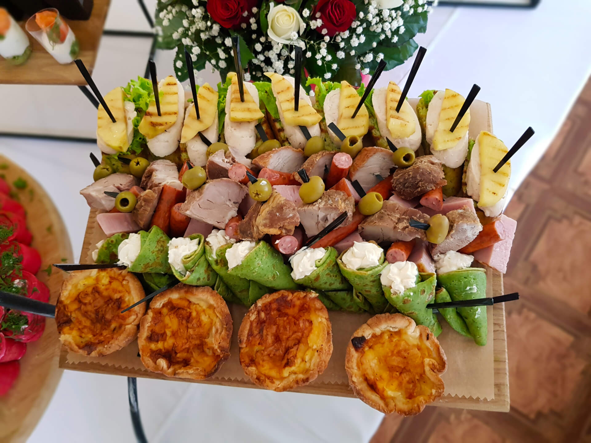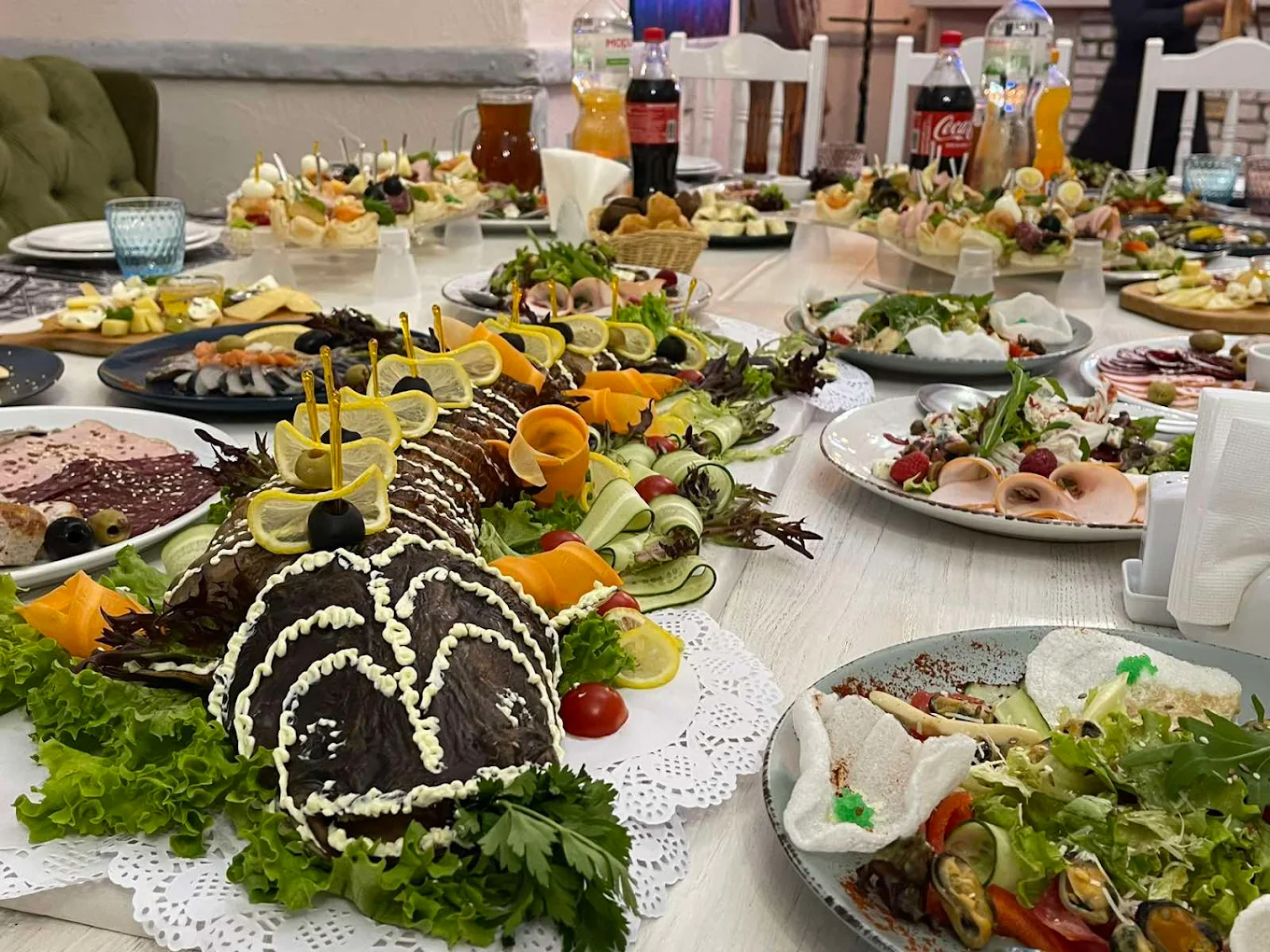 - Організація фуршетів. Заклад має досвід чудово організованих фуршетів на виїзд. Клієнти особливо відзначали оригінальне оформлення страв, таких як запечена у тісті червона риба у вигляді рибки та курочка, а також зручні фуршетні пиріжки-бантики.