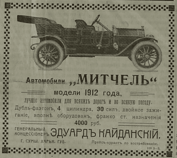 На початку XX століття автомобільний бум захопив російську імперію. Не залишилось на узбіччі процесу і повітове містечко Суми. Але якщо в 1900 роках авто купувались у столицях, то в 1910 роках його вже модна було замовити не виїжджаючи за межі міста. Особливо виділявся на цьому фоні молодий, красивий, епатажний поляк Кайдановський. Що він зробив: в той час, як, наприклад, харківські автосани пропонували покупцям “Бенци”, “Форди” чи “Фіати” молодий бізнесмен пропонував купити у нього американський “Мітчел”. Пропозиція була оригінальна і не грошовита для клієнтів. Крім того, пан Кайдановский продавав американські “Форди” та французькі “Дарраки”.